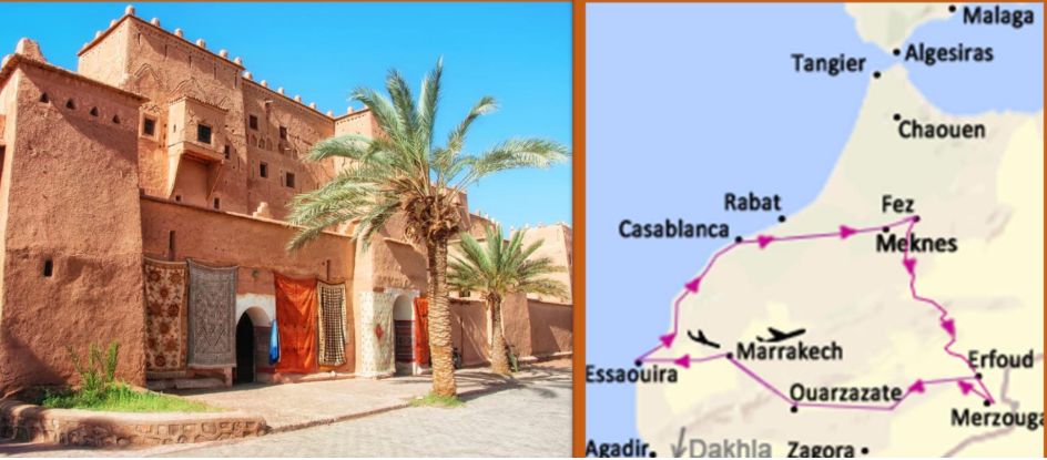 Marrakech -> Essaouira -> Casablanca -> Meknes-> Fez -> Ifrane -> Midelt -> Erfoud -> Merzouga -> Tinghir -> Ouarzazate -> Ait Benhaddou -> Marrakech
